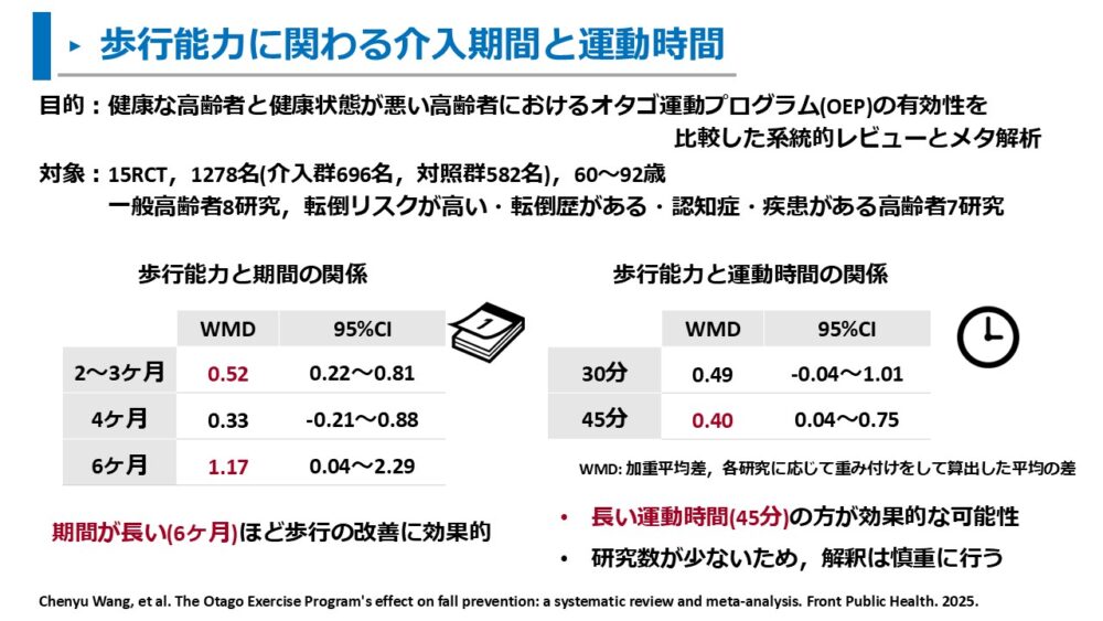 これは、オタゴ運動プログラムが運動時間30分など、特定の条件によって効果的であることを示すが、最適な運動時間は参加者の特性や研究条件によって異なる可能性がある。