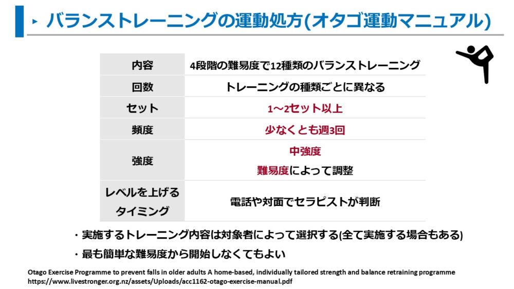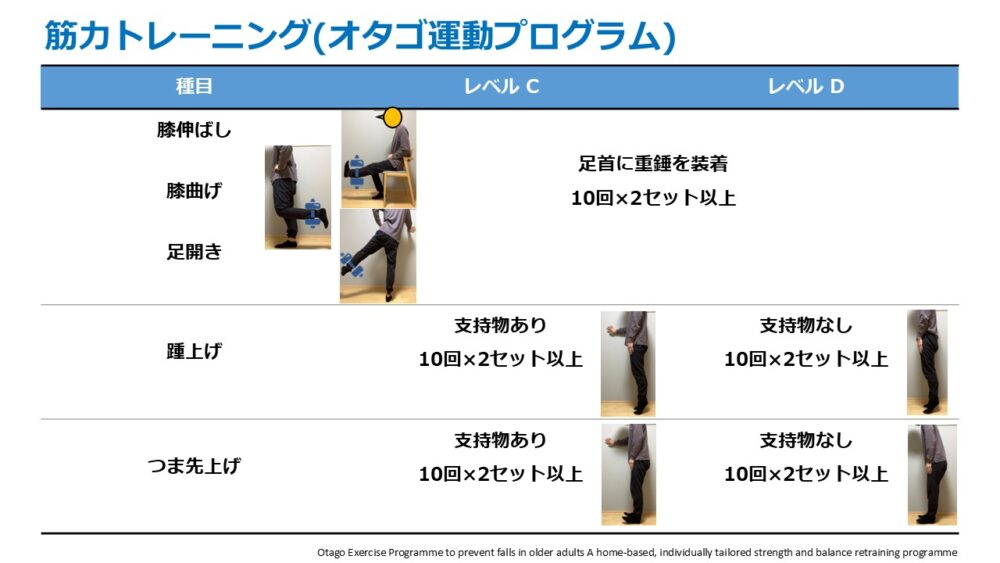 - オタゴ運動プログラムは高齢者のバランス能力、歩行能力、下肢筋力を有意に改善という高いエビデンスが示されている