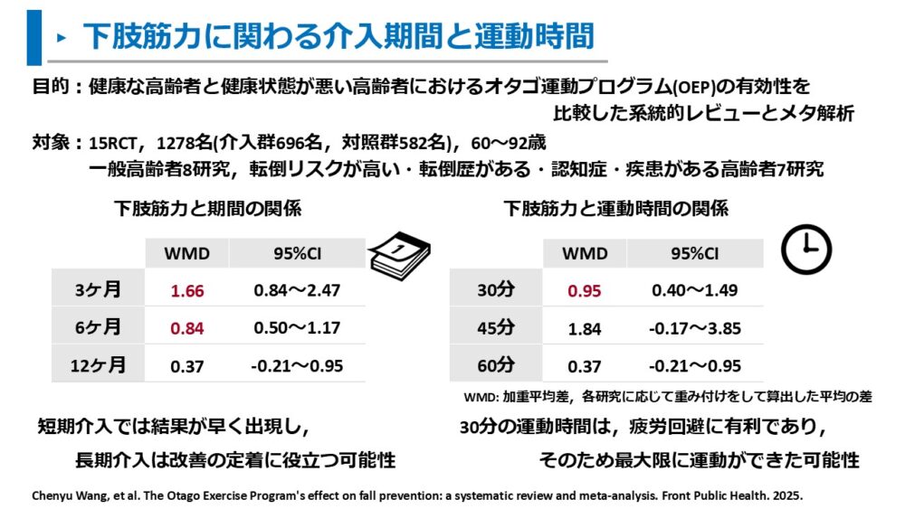 下肢筋力については、短期介入では結果が早く出現し、長期介入では改善の定着に役立つ可能性がある。