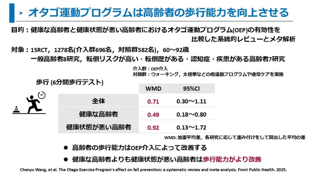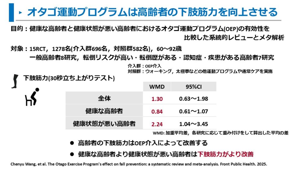 - オタゴ運動プログラムの介入によって、高齢者のバランス能力、下肢筋力、歩行能力は有意に向上する