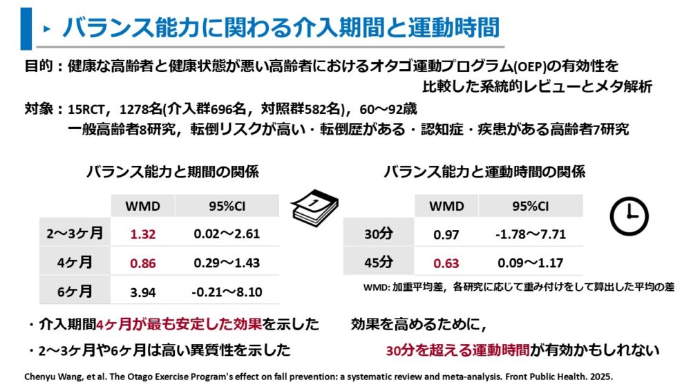 - バランス能力の改善には、介入期間4ヶ月、1回の運動時間は30分を超える方が有効かもしれない