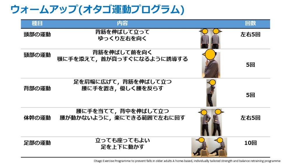オタゴ運動プログラムを用いた研究をみると、ウォーミングアップを実施しなかった調査もありました。