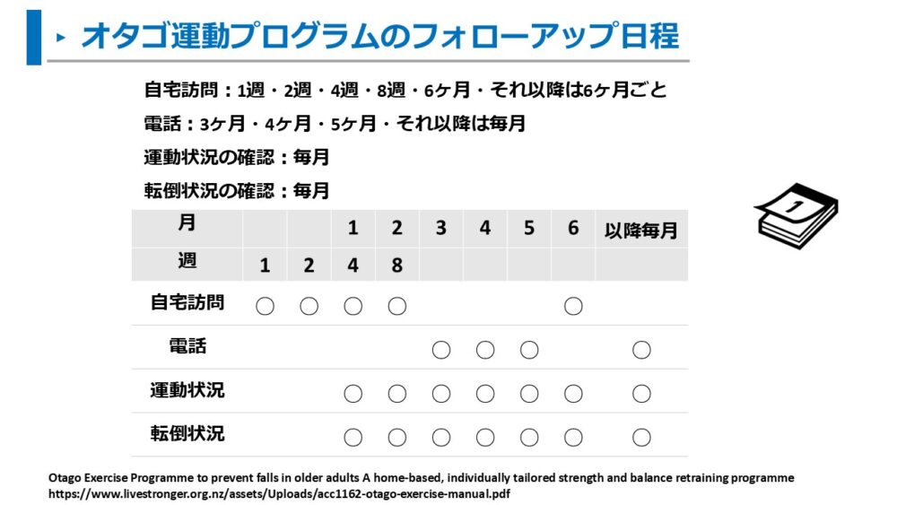オタゴ運動プログラムでは、運動内容や難易度を調整・指導した後、定期的にフォローアップする点も特徴です。