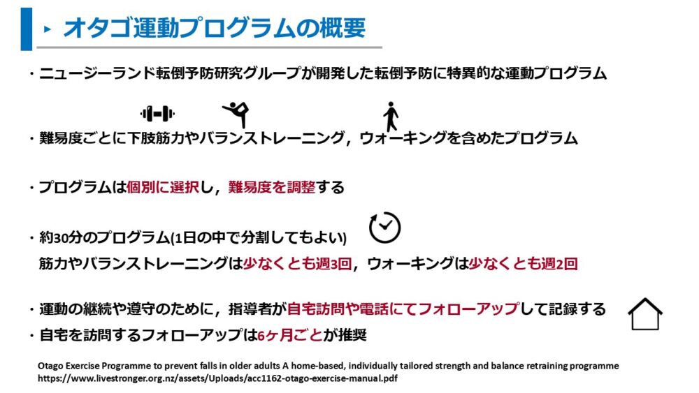 - オタゴ運動プログラムでは介護施設やデジタル技術を用いた介入でも効果があり、広い分野で活用できる