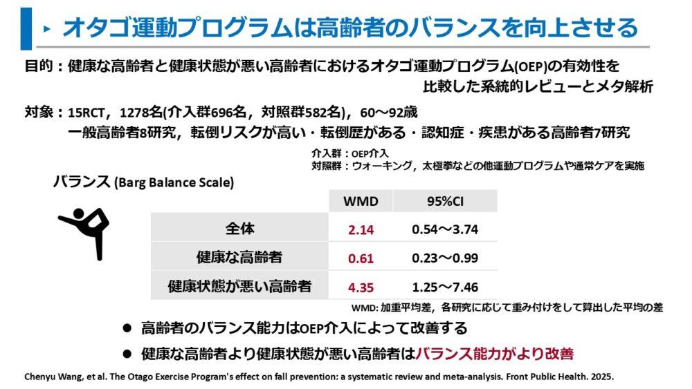 Wangらによる、オタゴ運動プログラムの効果に関する系統的レビューとメタ解析の結果をまとめると以下のことがわかります。