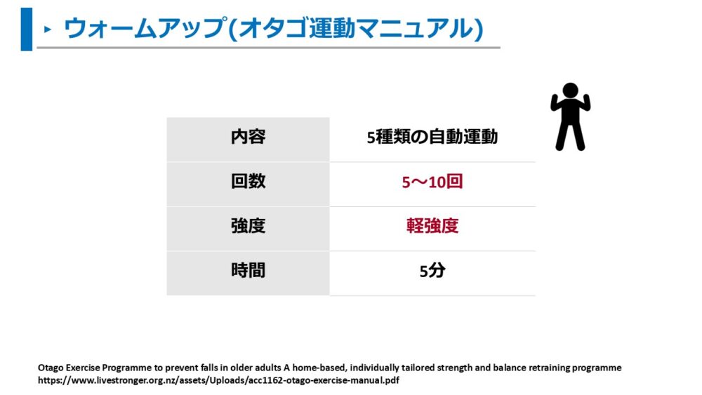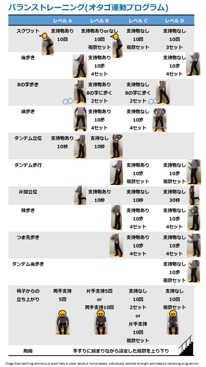 - オタゴ運動プログラムは、ウォーミングアップ、下肢の筋力トレーニング、バランストレーニング、ウォーキングの4項目から構成され、難易度を変えながら運動ができる