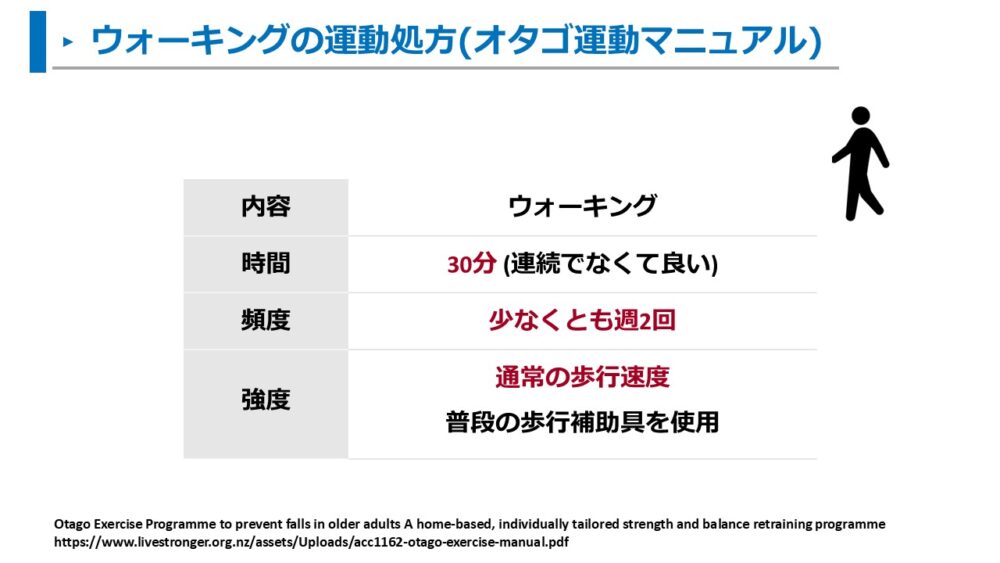 実施する頻度は、下肢筋力トレーニングとバランストレーニングは少なくとも週3回、ウォーキングは少なくとも週2回としています。