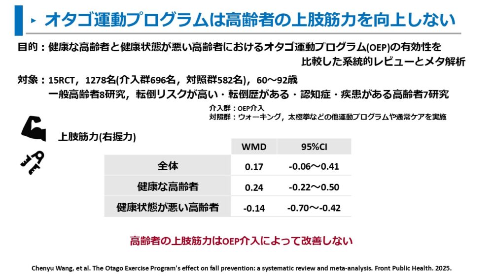 また、握力を指標とした上肢筋力に関してもオタゴ運動プログラムは有効性がない可能性が示されています。
