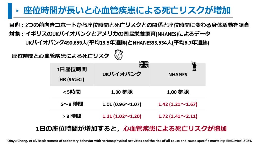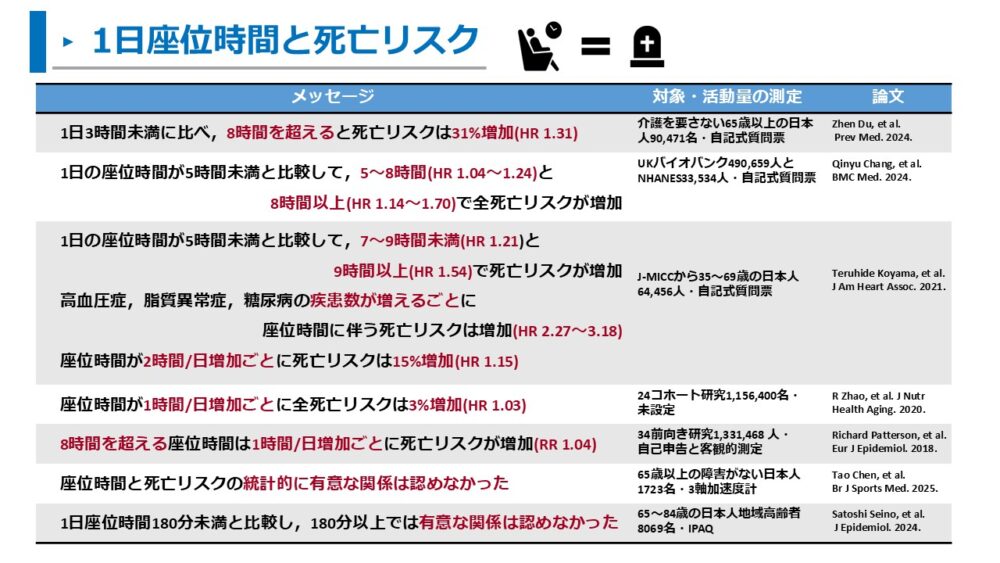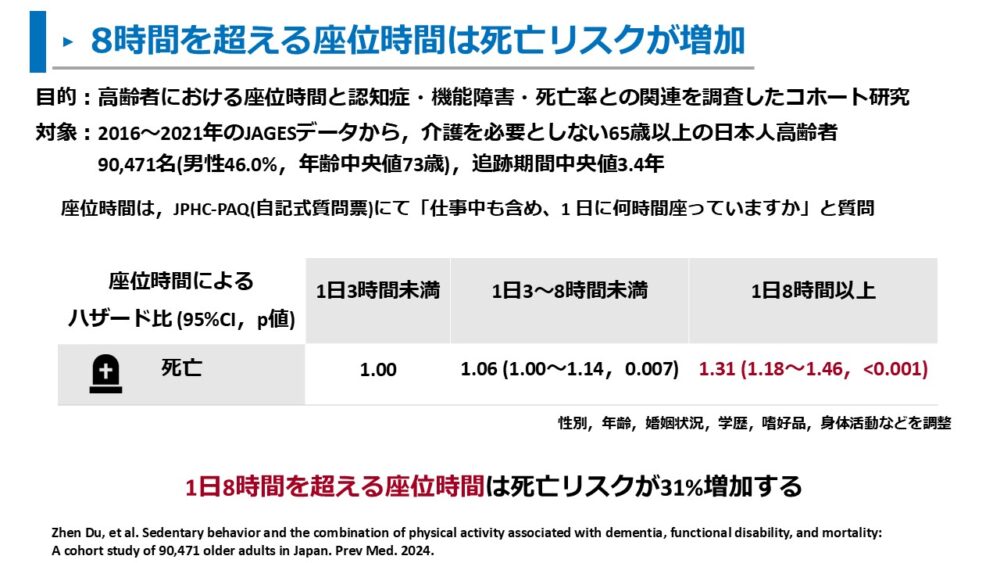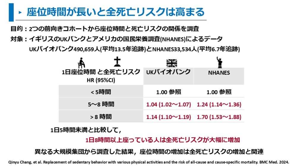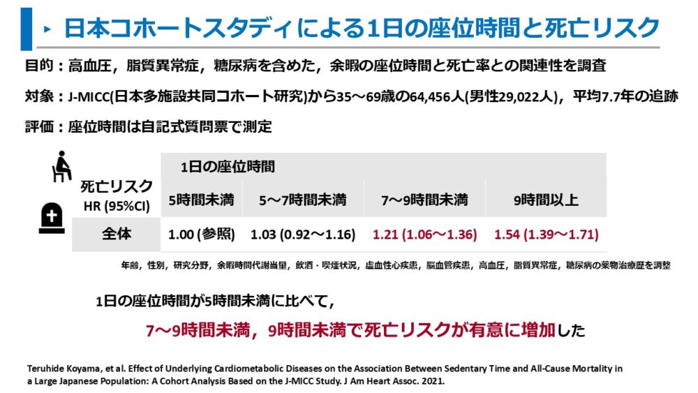 日本における調査でも、座位時間が長いと死亡リスクが増加することが報告されています。