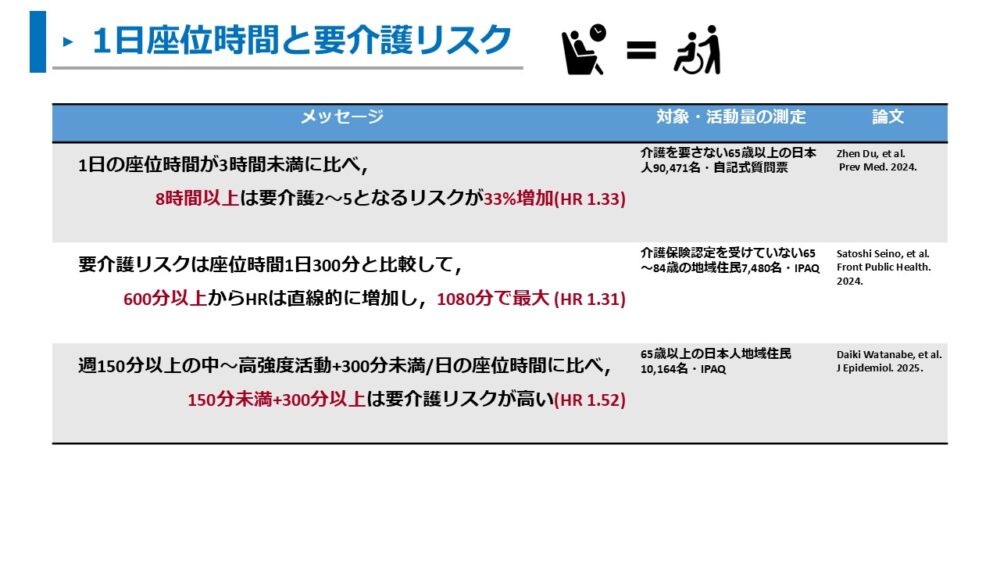 - 長い座位時間は要介護リスクや疾患発症リスクが増加する