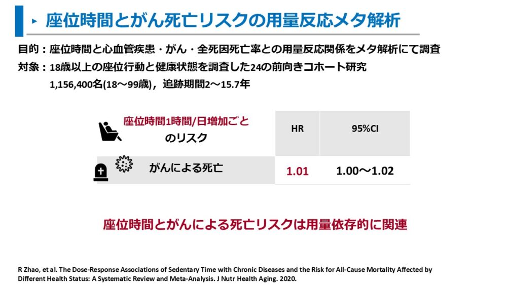また、がんによる死亡リスクは座位時間と用量依存的に増加することが報告されています。