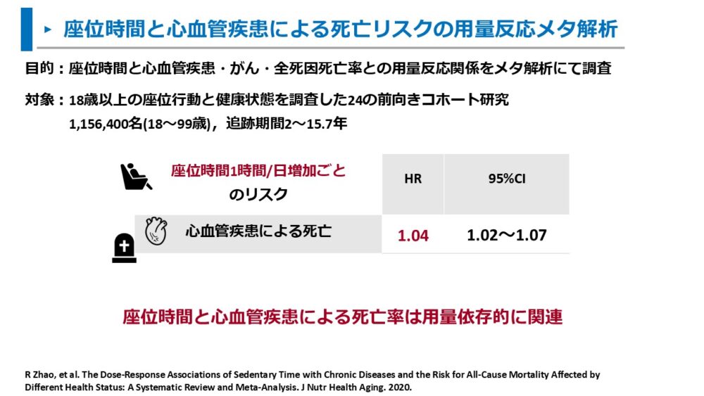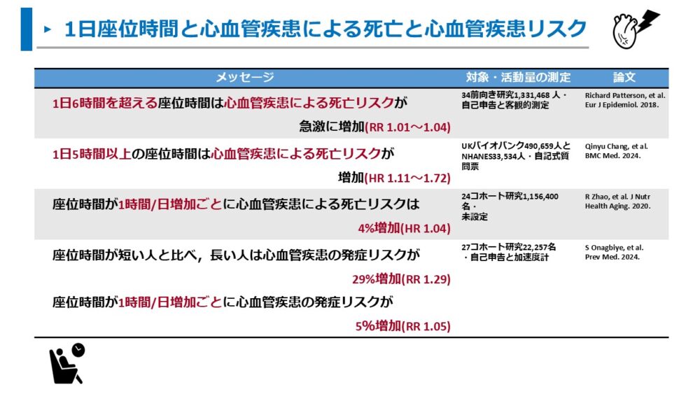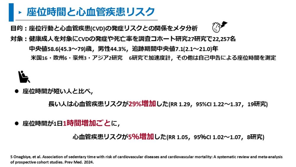 ここまで、座位時間と心血管疾患による死亡リスクや心血管疾患の発症リスクについて解説しました。