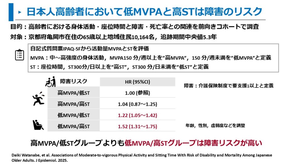 - Daiki Watanabe, et al. Associations of Moderate-to-vigorous Physical Activity and Sitting Time With Risk of Disability and Mortality Among Japanese Older Adults. J Epidemiol. 2025.
