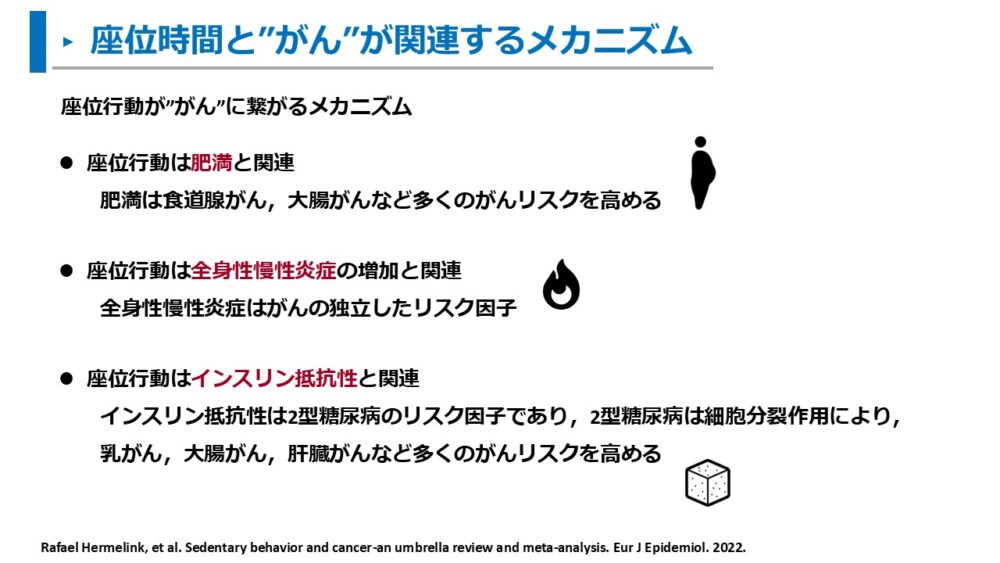 - 座位行動は全身性の慢性炎症と関連:座位で過ごす時間が長いと全身性の慢性炎症を引き起こす。慢性炎症はがんの独立したリスク因子。