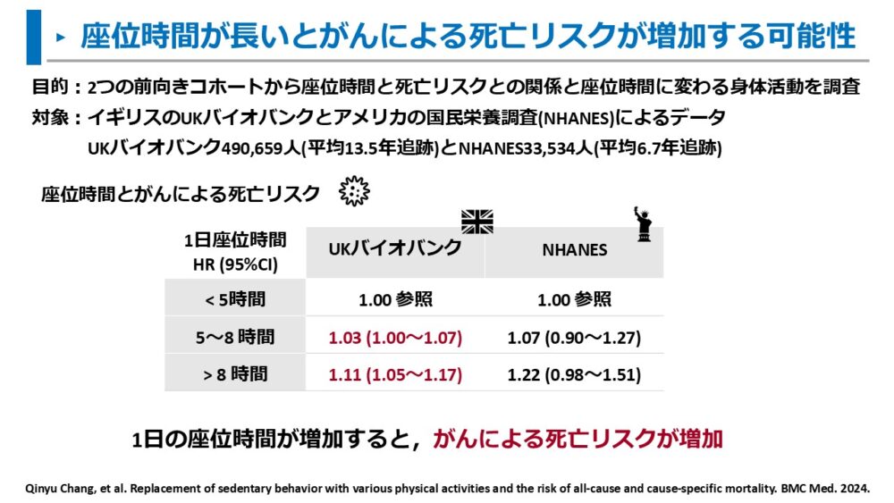 Changらは、イギリスのUKバイオバンクとアメリカのNHANESの大規模データから座位時間とがんによる死亡リスクを調査しました3)。