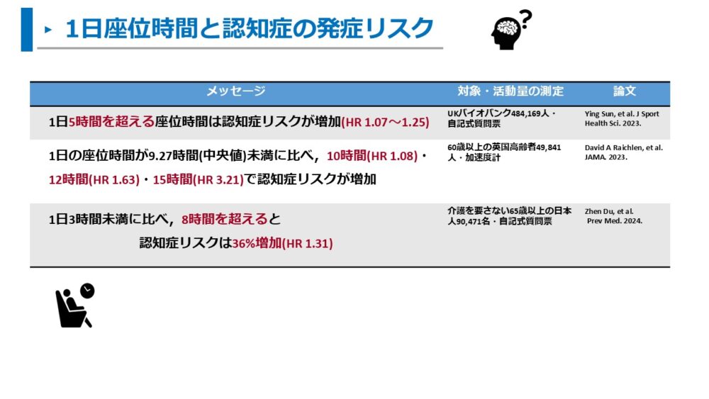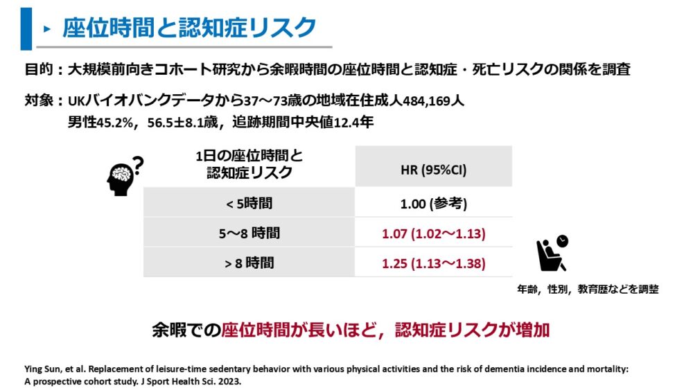日本人における調査でも、座位時間が長いことは認知症のリスクを増加させることが明らかとなっています。