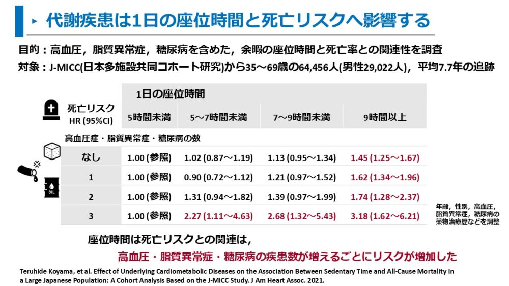 - 日本人を対象とした調査において、高血圧症、糖尿病、脂質異常症があると座位時間による死亡リスクは増加しやすく、最大2倍以上も死亡リスクが増加