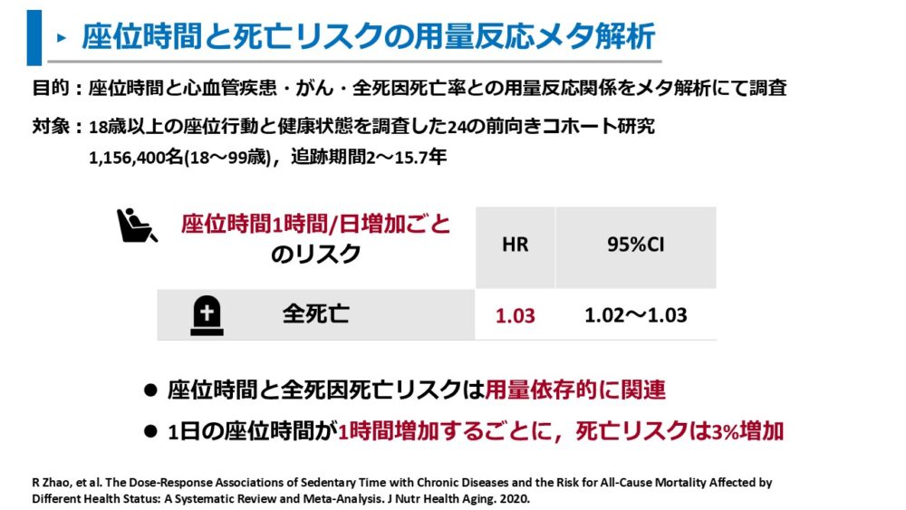 さまざまな国での大規模なコホート研究やメタ解析をみると、1日の座位時間が長いことは死亡リスクを増加させる要因と考えられます。