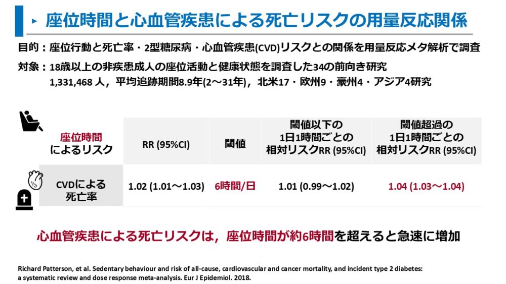 - 1日の座位時間が8時間よりも長い場合は、座位時間が1時間増加ごとの死亡リスクが急激に増加する(RR 1.04、95%CI 1.03~1.05)