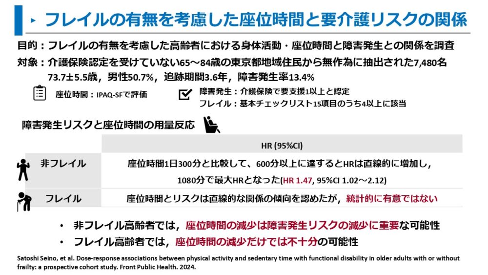 - Satoshi Seino, et al. Dose-response associations between physical activity and sedentary time with functional disability in older adults with or without frailty: a prospective cohort study. Front Public Health. 2024.