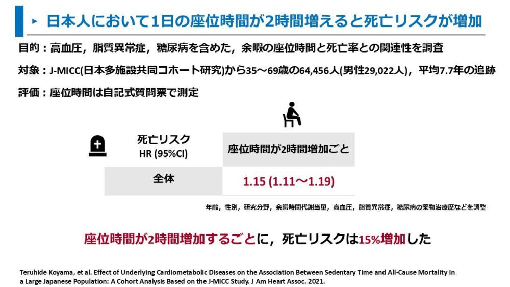 日本人を対象とした研究において、1日2時間の座位時間が増えることは死亡リスクが増加することが示されています。