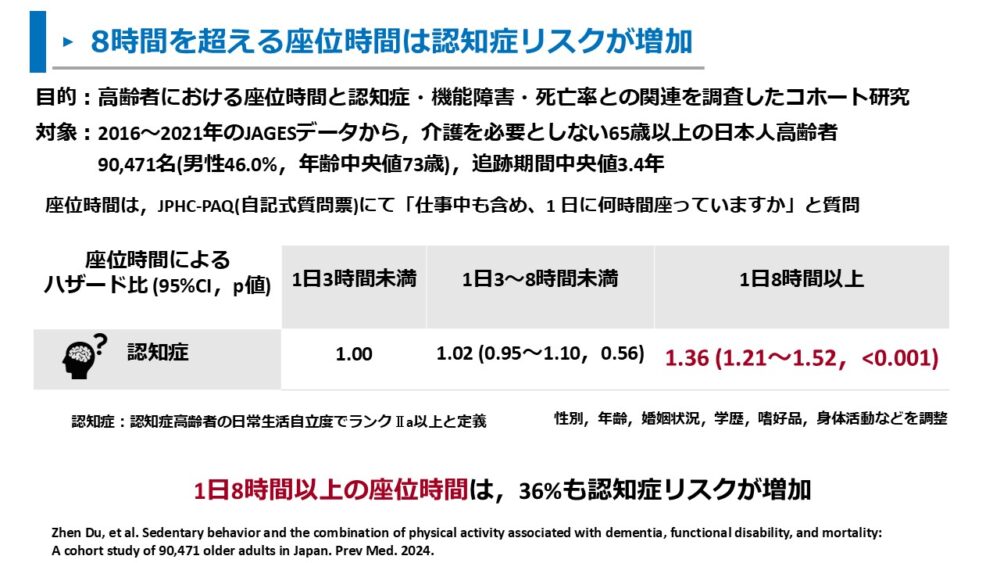 Duらは、日本人高齢者における座位時間と認知症の関係をコホート研究にて調査しました2)。