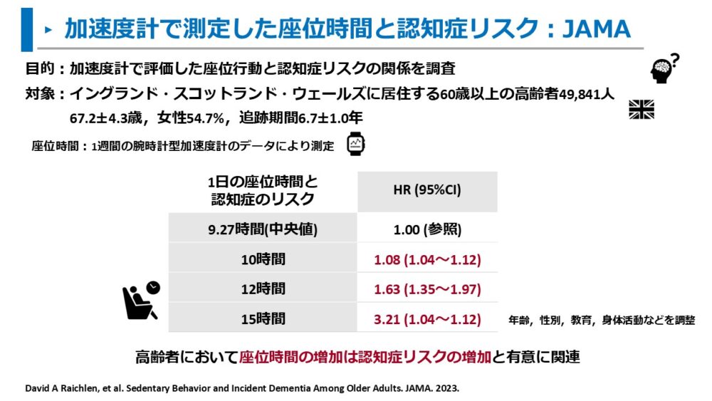 Raichlenらは、加速度計で評価した座位行動と認知症リスクの関係を調査しました15)。
