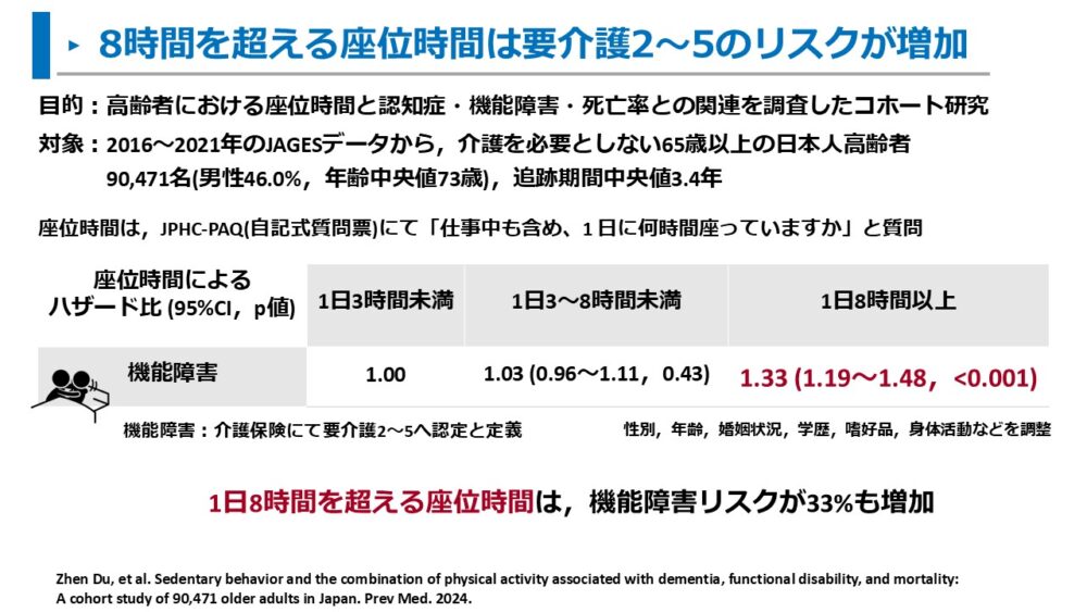 Duらは、日本老年学的評価研究(JAGES)のデータから高齢者の座位時間と機能障害(要介護2~5)の関係をコホート研究で調査しました2)。