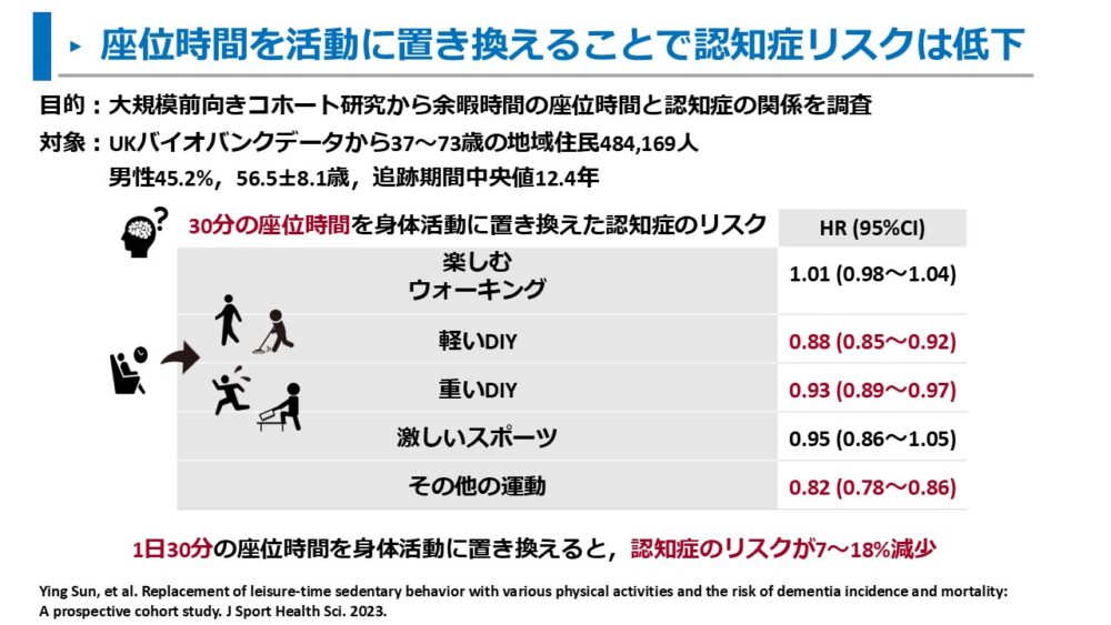 大規模な前向きコホート研究から、座位時間を身体活動に置き換えることで認知症予防の効果が期待できます。