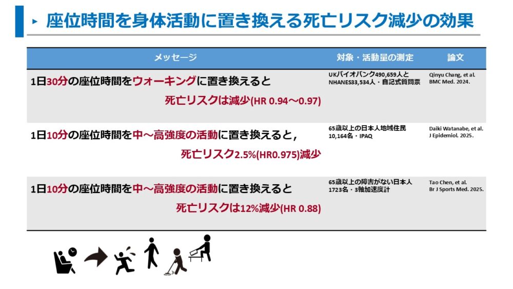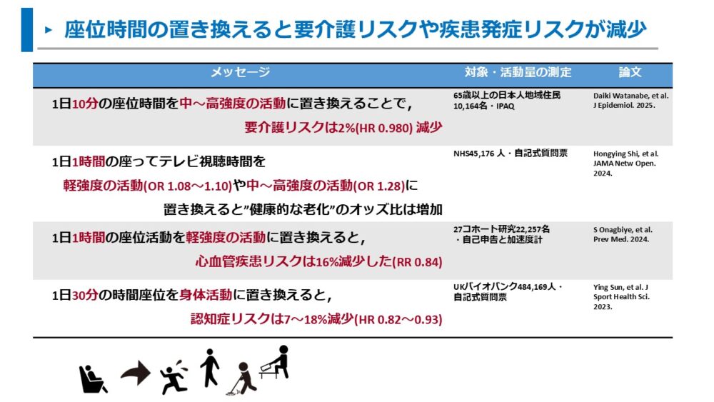 座位時間を身体活動に置き換えることは、予防や健康の維持に重要です。