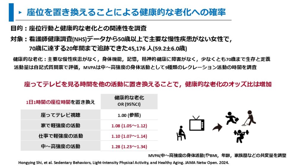 - 1時間の座位時間を仕事や家での軽強度活動に置き換えることで、“健康的な老化”へのオッズ比が増加する
