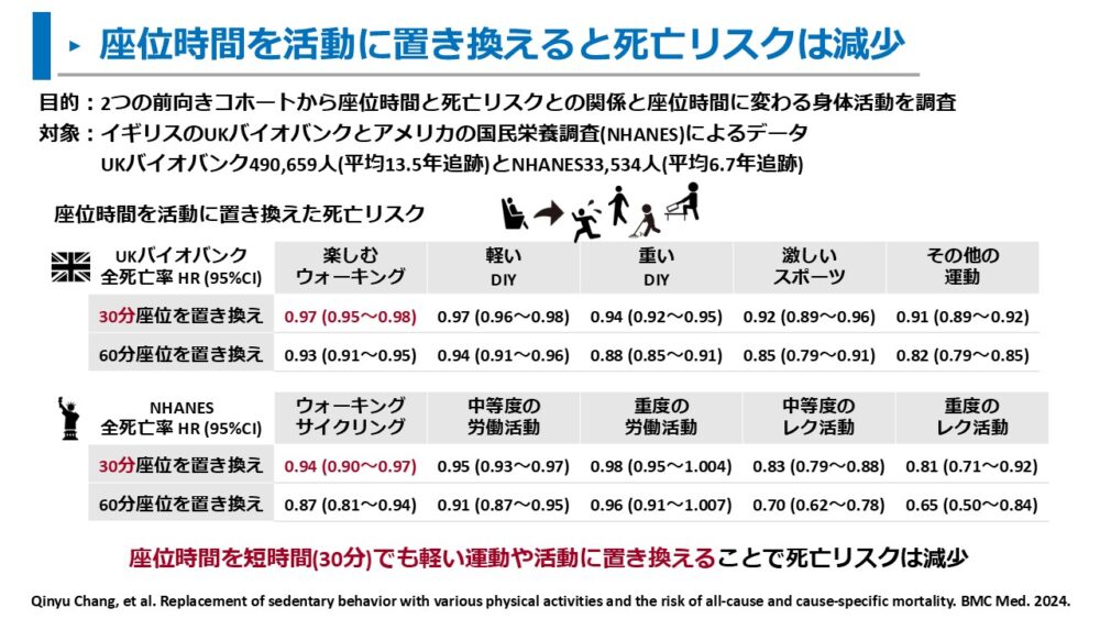 Changらは、イギリスのUKバイオバンクとアメリカの国民栄養調査(NHANES)という大規模データから、座位時間を身体活動に置き換えた死亡リスクへの効果を調査しました2)。