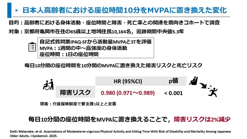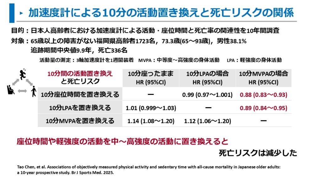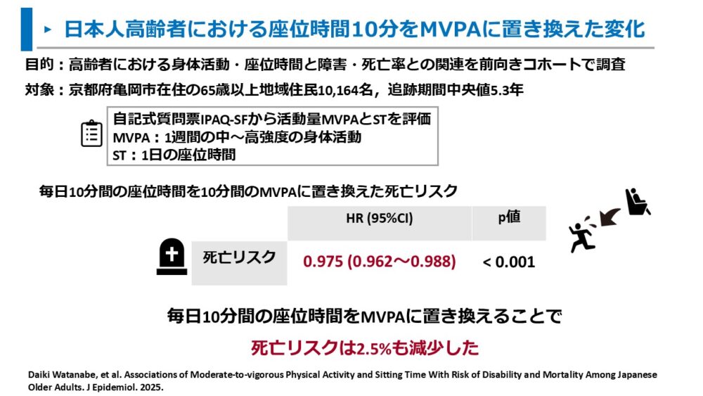 日本人の地域高齢者においても、1日10分の座位時間を中~高強度の活動に置き換えることで死亡リスクが減少することが明らかとなっています。