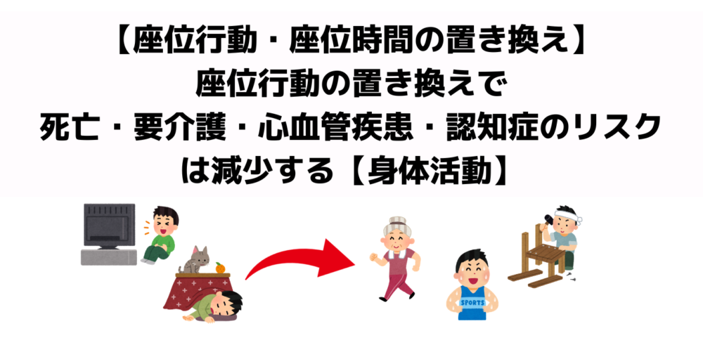 座位時間を身体活動に置き換えることは、予防や健康の維持に重要です。