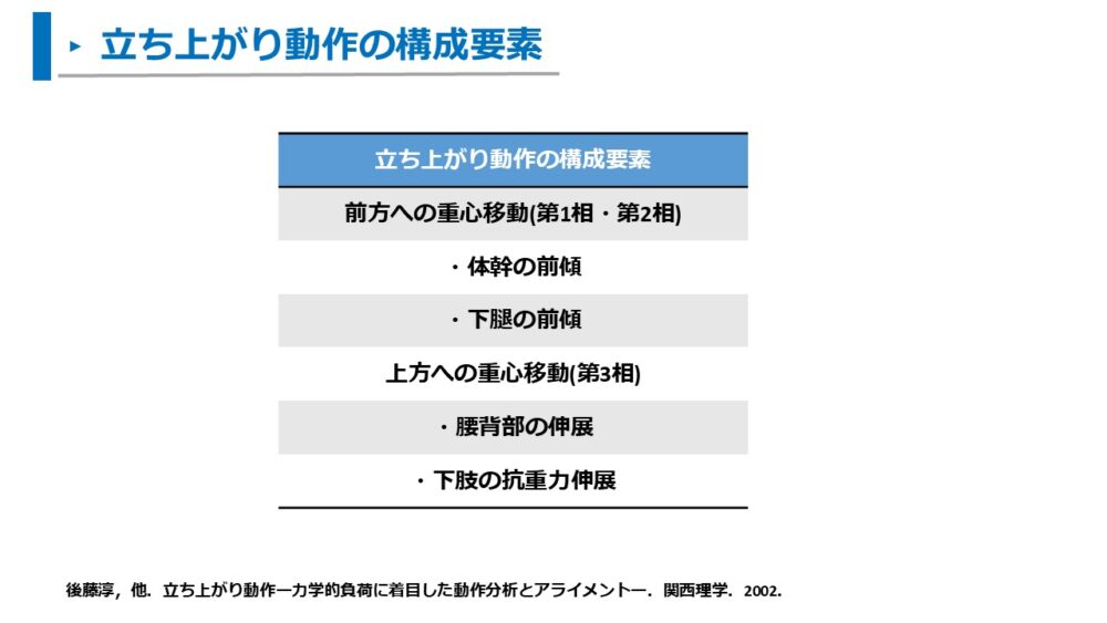 椅子からの立ち上がり動作は以下の要素で構成されています1)。