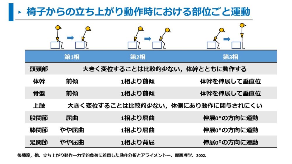 立ち上がり動作における3相ごとの頭頚部~足部までの運動は以下にまとめています1)。