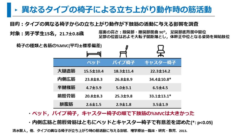 - 清水智人,他.タイプの異なる椅子が立ち上がり時の筋活動に与える影響.理学療法ー臨床・研究・教育.2013.