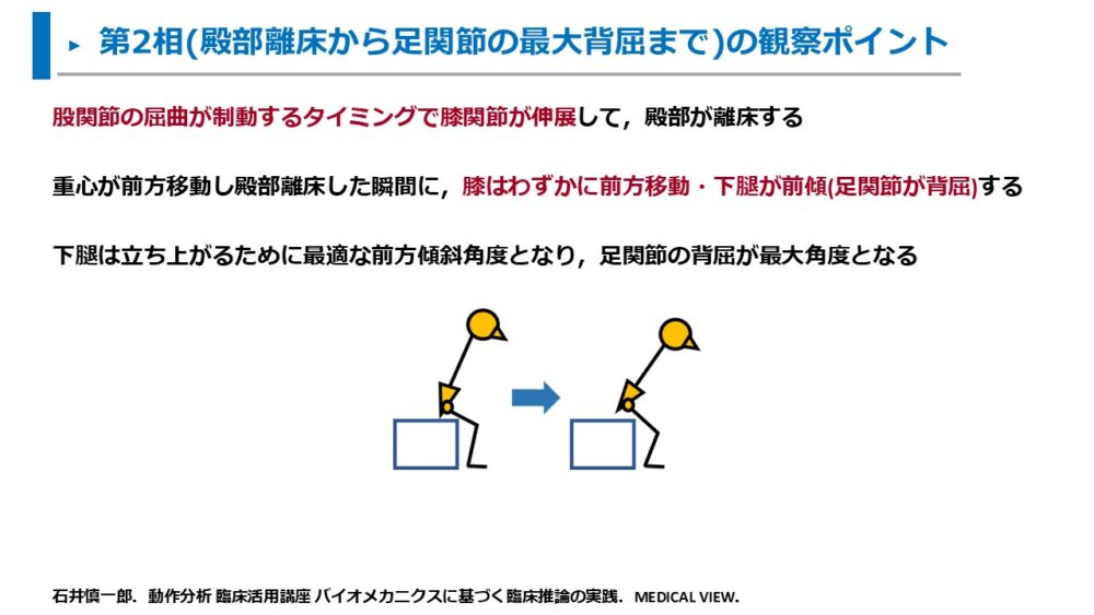- 第2相のポイント:股関節の屈曲が制限されるタイミングで膝関節が伸展して、殿部が離床する・重心が前方移動し殿部離床した瞬間に、膝はわずかに前方移動・下腿が前傾(足関節が背屈)する