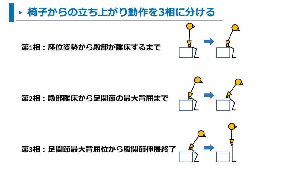 動作を観察しやすくするため、椅子からの立ち上がり動作では第1~3相に分けます。