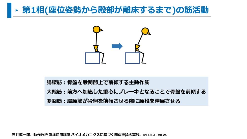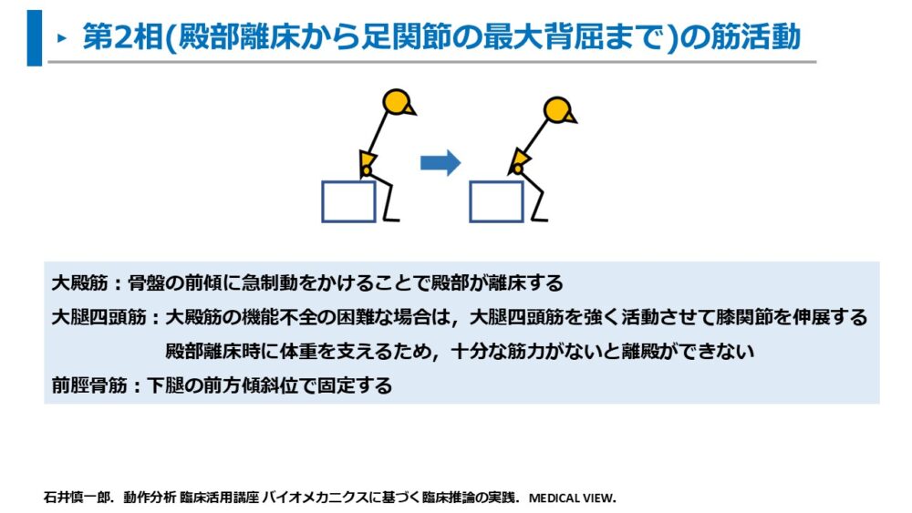- 第2~3相の筋活動は、大腿四頭筋・ハムストリングス・大殿筋・脊柱起立筋・腓腹筋の筋活動が重要