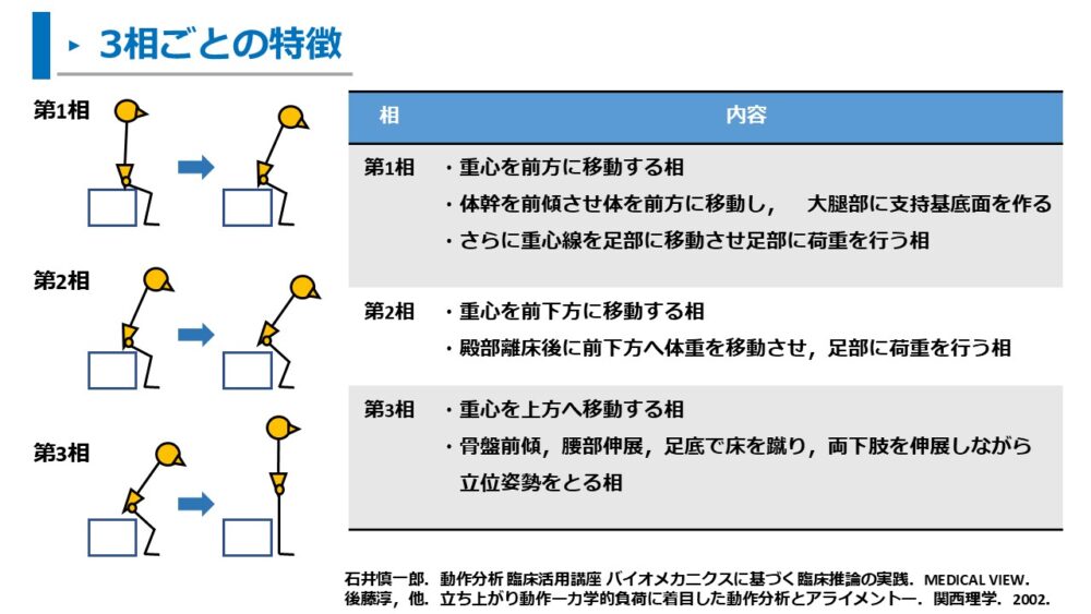 各相で立ち上がり動作に重要となる重心の移動に特徴があります。