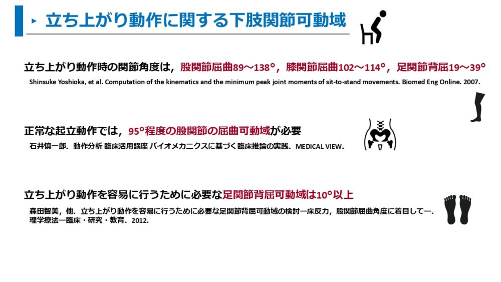 - 正常な立ち上がり動作に必要な関節角度は、股関節屈曲95°以上、足関節背屈10°以上と報告がある