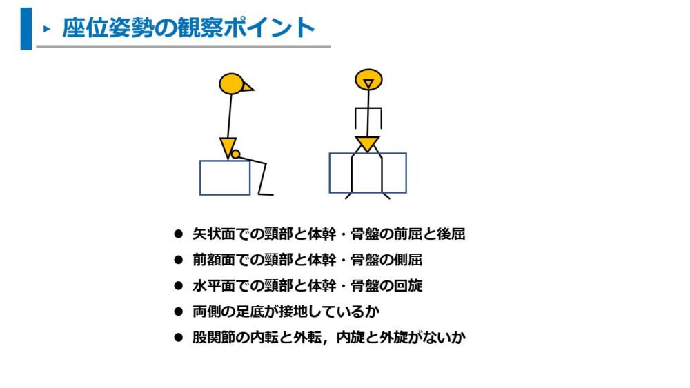 立ち上がり動作の前段階となる、座位姿勢を評価することも重要です。