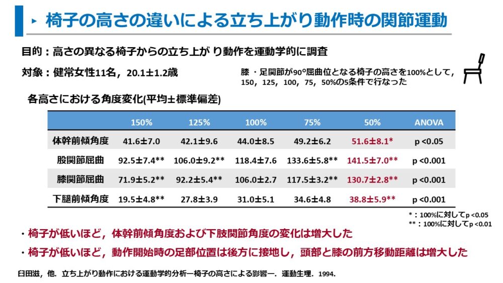 - 椅子が高いと動作時の関節運動は小さく、低いと関節運動は大きくなる