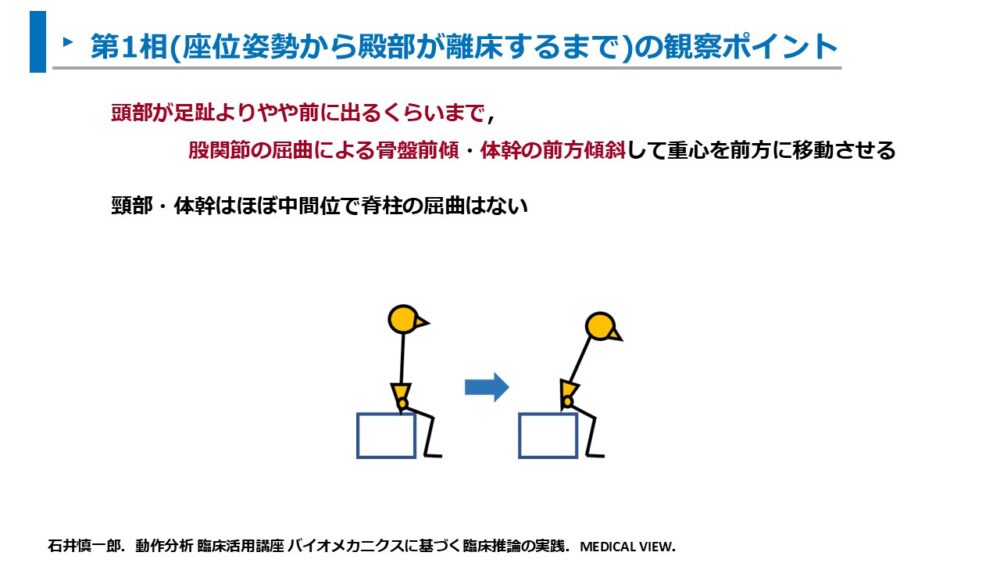 - 第1相の観察ポイント:頭部が足趾よりやや前に出るくらいまで股関節の屈曲して骨盤前傾・体幹を前方に傾斜して重心を前方移動する