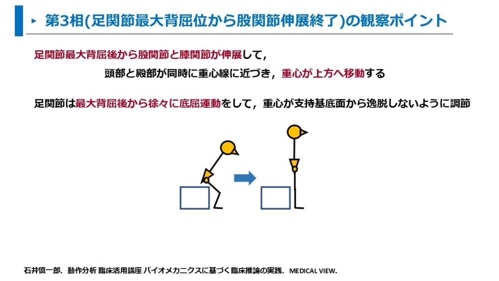 - 第3相の観察ポイント:足関節最大背屈後から股関節と膝関節が伸展して頭部と殿部が同時に重心線に近づく