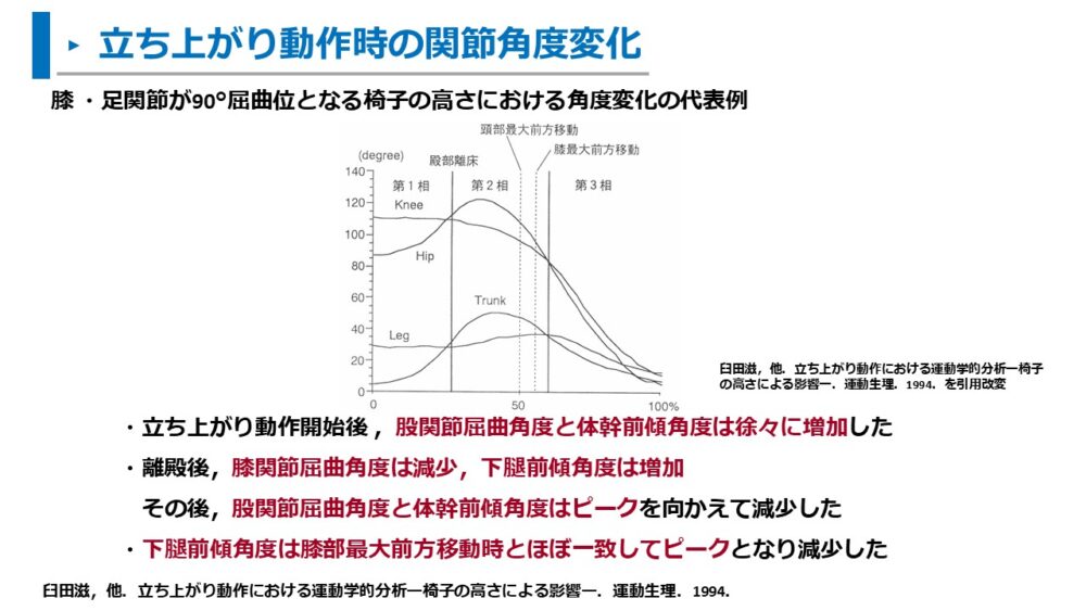 臼田らは、膝関節と足関節が90°屈曲位となる椅子の高さでの立ち上がり動作時の角度変化を以下のように述べています3)。