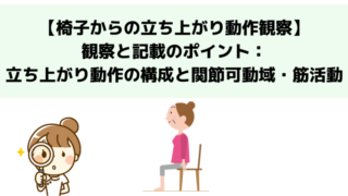 評価 【椅子からの立ち上がり動作観察】観察と記載のポイント:立ち上がり動作の構成と関節可動域・筋活動【動作観察】 立ち上がり動作の観察分析が難しい正常な動作がわからない書き方がわからない立ち上がり動作を観察するコツが知りたい立ち上がり動作観察は、身体機能や動作能力をみるためにも重要な評価です。しかし、学生時代や新人時代は苦戦した人も多いのではないのでし... 2025.10.19 評価関節可動域
